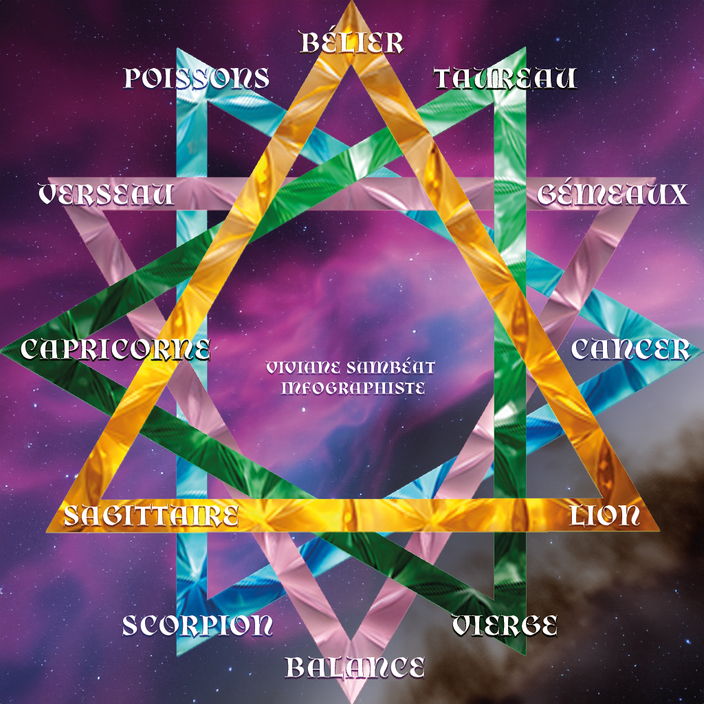 Lorsque cette étoile est formée en nous, nous sommes prêt à comprendre ce qui semble contradictoire et nous pouvons intégrer harmonieusement, l’élément Eau à l’élément Feu, étant donné que le 1e triangle relie les signes de Feu (Bélier, Lion, Sagittaire, jaune), le 2e triangle les signes d’Eau (Cancer, Scorpion, Poissons, bleu) 3e triangle les Signes d’Air (Gémeaux, Balance, Verseau, rose), 4e triangle les signes de Terre (Taureau, Vierge, Capricorne, vert) voir le schéma ci-dessous.