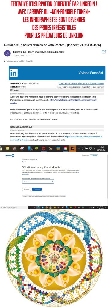 Sur Discord dans le groupe Discord XD et Illustrator se trouve un projet fait par des catalans escrocs qui se font passer pour un événement Adobe (qui dure 9 jours) eux c’est 39 jours qui récupérera gratuitement votre travail qui sera ensuite revendu sur leur site et vous serez leur gentil esclave crédule (Gullible : le même nom que la chaîne pour enfants) seulement l’un d’entre eux a vu mon compte LinkedIn et un complice ( ou avec la complicité de LinkedIn) a tenté de récupérer ma carte d’identité ! Donc pour me défendre j’utilise mon arme favorite : Illustrator ! Voilà comment se protéger des escrocs sans scrupules qui pullulent sur le web : (oui j’ai fait une coquille en forme de lapsus ! Car cette façon d’agir va faire « péter les plombs/fusibles » des adeptes de la cancel culture qui se la pète plus haut que leur cul ! )