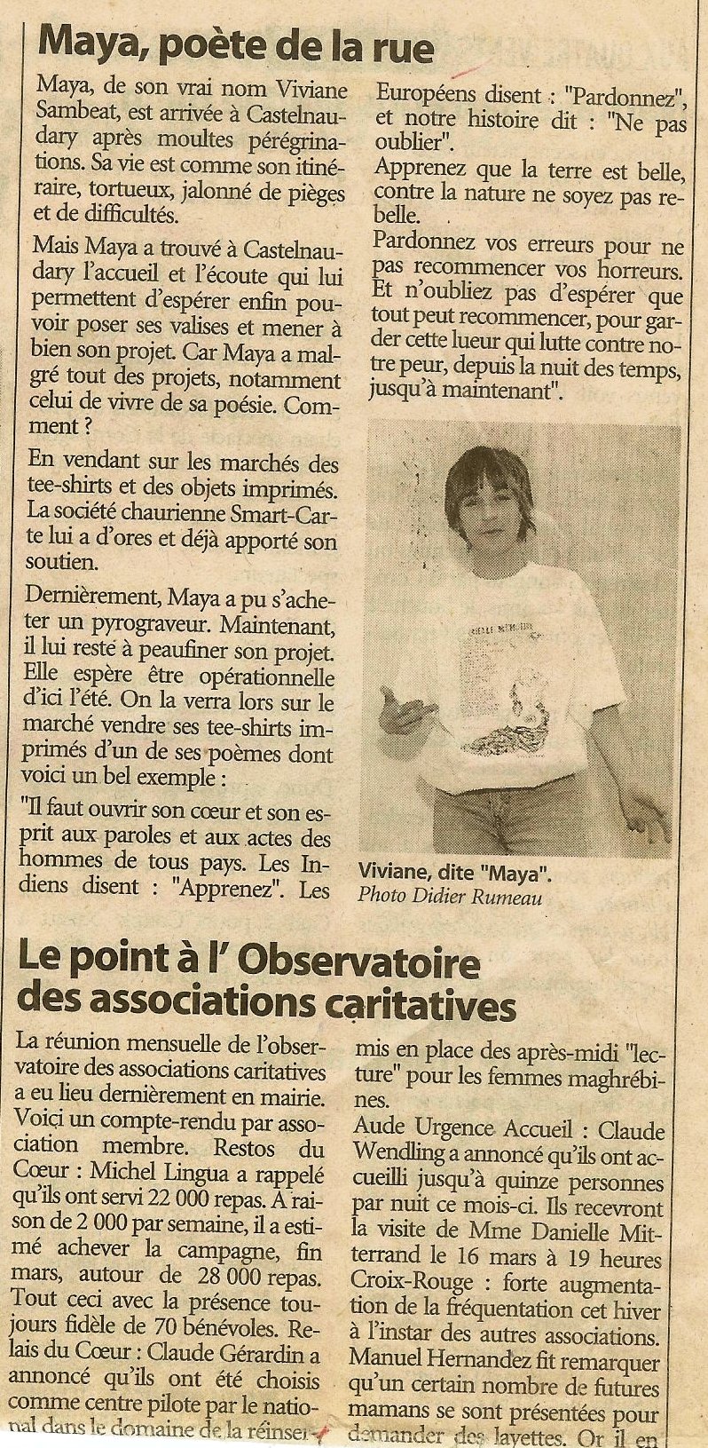 Viviane : Voici un poème que j’ai écrit il y a 33 ans En étant sans domicile fixe :