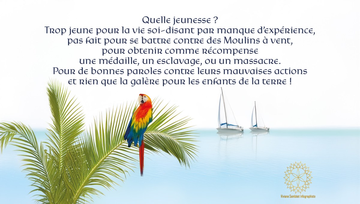 « Trop jeunes pour la vie, soit disant pat manque d’expériences. Pas fait pour se battre contre des moulins à vent ! Pour obtenir comme récompenses : une médaille, un esclavage ou un massacre ! Pour de bonnes paroles contre leurs mauvaises actions et rien que la galère pour les enfants de la Terre ! »