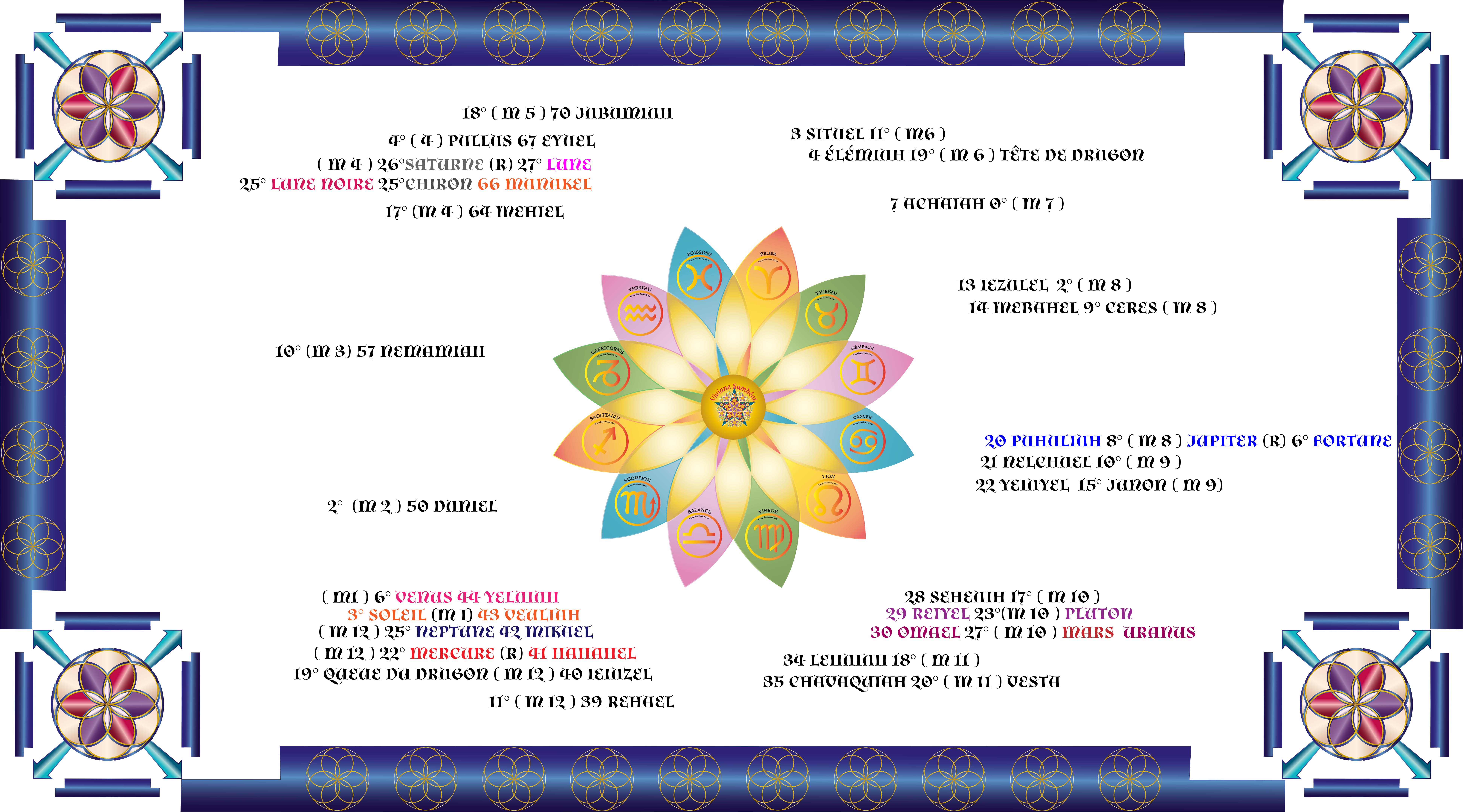 66 Manakel, l’ange de la connaissance du bien et du mal, activé par Saturne, la Lune, la Lune Noire, Chiron et la part de Fortune, associé à la maison 4 du foyer.