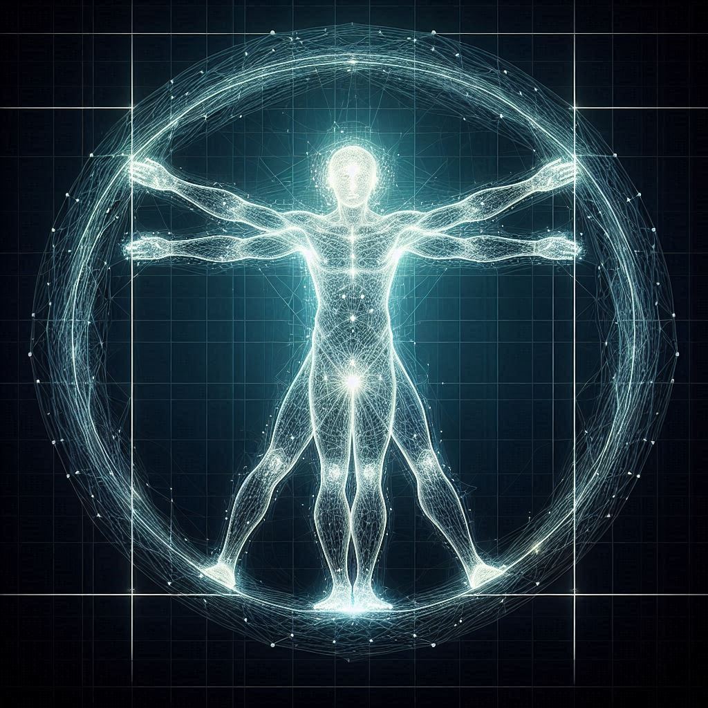 L’image combine une interprétation du l’homme de Vitruve dans un style lumineux et la représentation du drapeau catalan, qui synthétise la vision symbolique de l’infographie – un symbole fort de ma démarche créative et innovante.