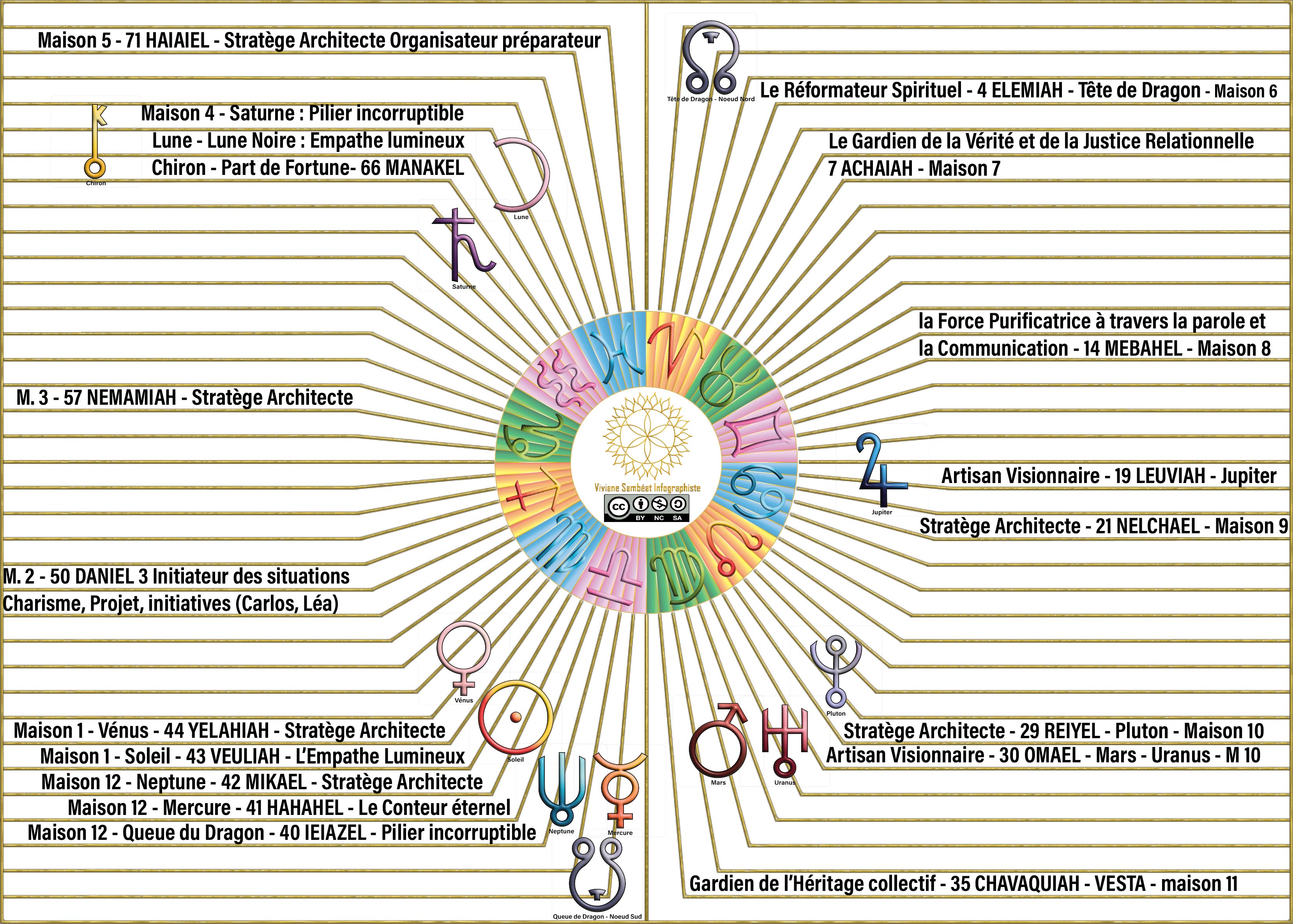 Les différentes configurations planétaires et la sagesse des 72 Anges Gardiens ont servi de base pour décrypter les dynamiques intérieures, les défis karmiques et les forces en jeu.