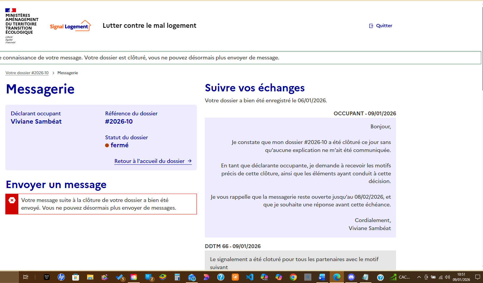 - Réponse partielle de la DDTM 66 : « Le signalement a été clôturé pour tous les partenaires avec le motif suivant… » (motif non affiché)
